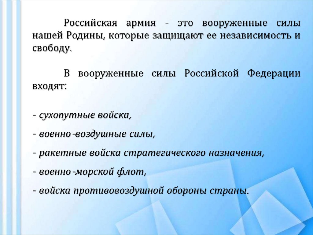 Российская армия - это вооруженные силынашей Родины, которые защищают ее независимость и