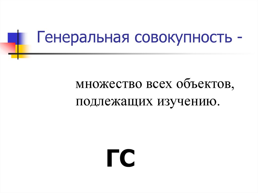 Генеральная совокупность множество всех объектов,подлежащих изучению.