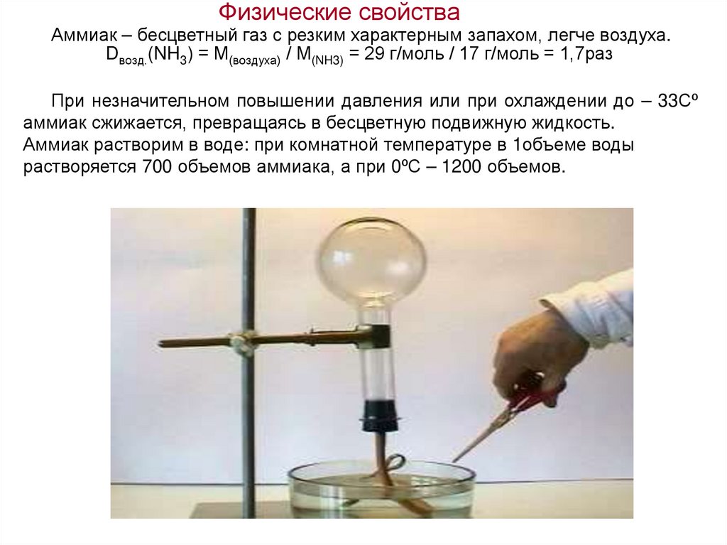 Физические свойстваАммиак – бесцветный газ с резким характерным запахом, легче воздуха.