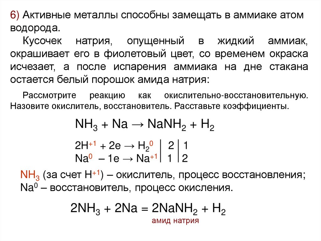 6) Активные металлы способны замещать в аммиаке атомводорода.