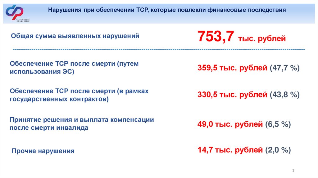 Нарушения при обеспечении ТСР, которые повлекли финансовые последствияОбщая сумма выявленных нарушений