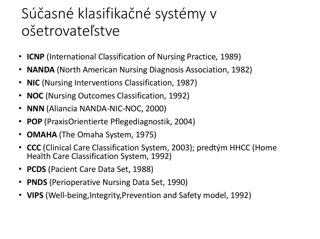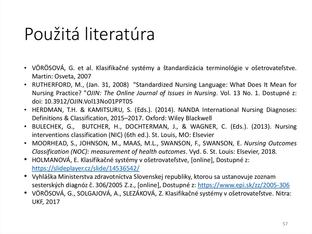• HOLMANOVÁ, E. Klasifikačné systémy v ošetrovateľstve, [online], Dostupné z: