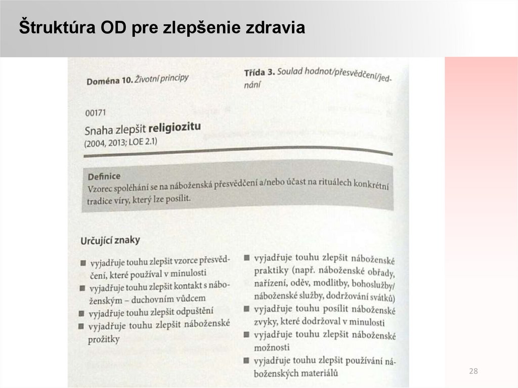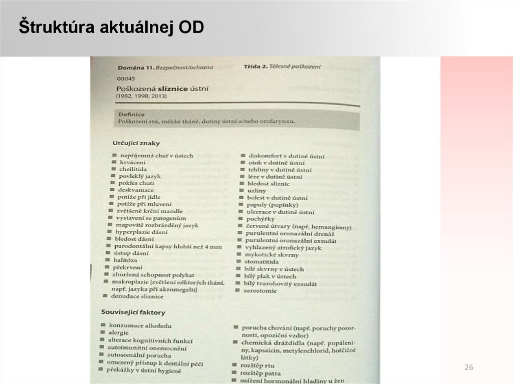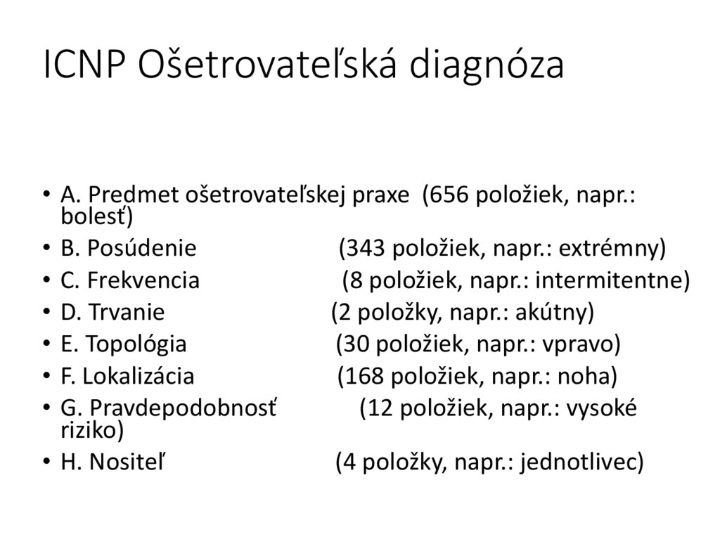 ICNP Ošetrovateľská diagnóza• A. Predmet ošetrovateľskej praxe (656 položiek, napr.: