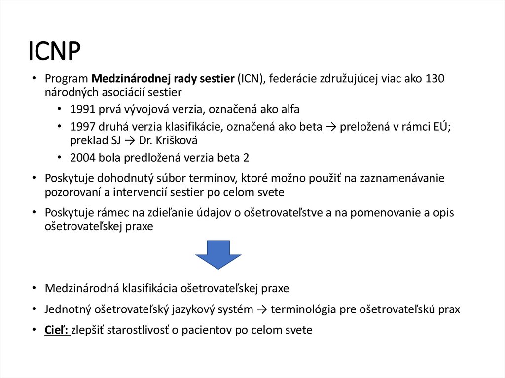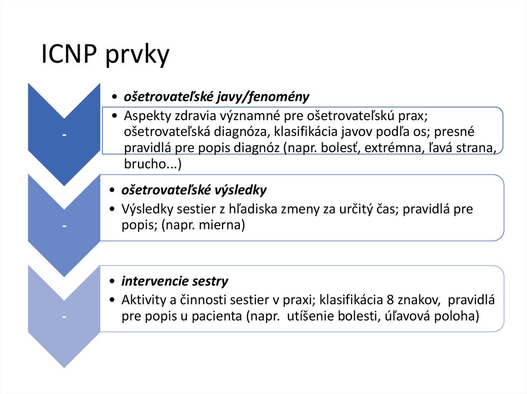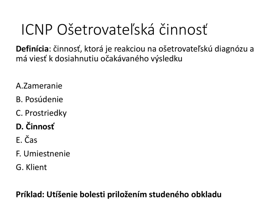 ICNP Ošetrovateľská činnosťDefinícia: činnosť, ktorá je reakciou na ošetrovateľskú diagnózu a