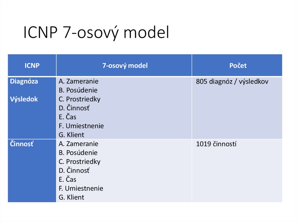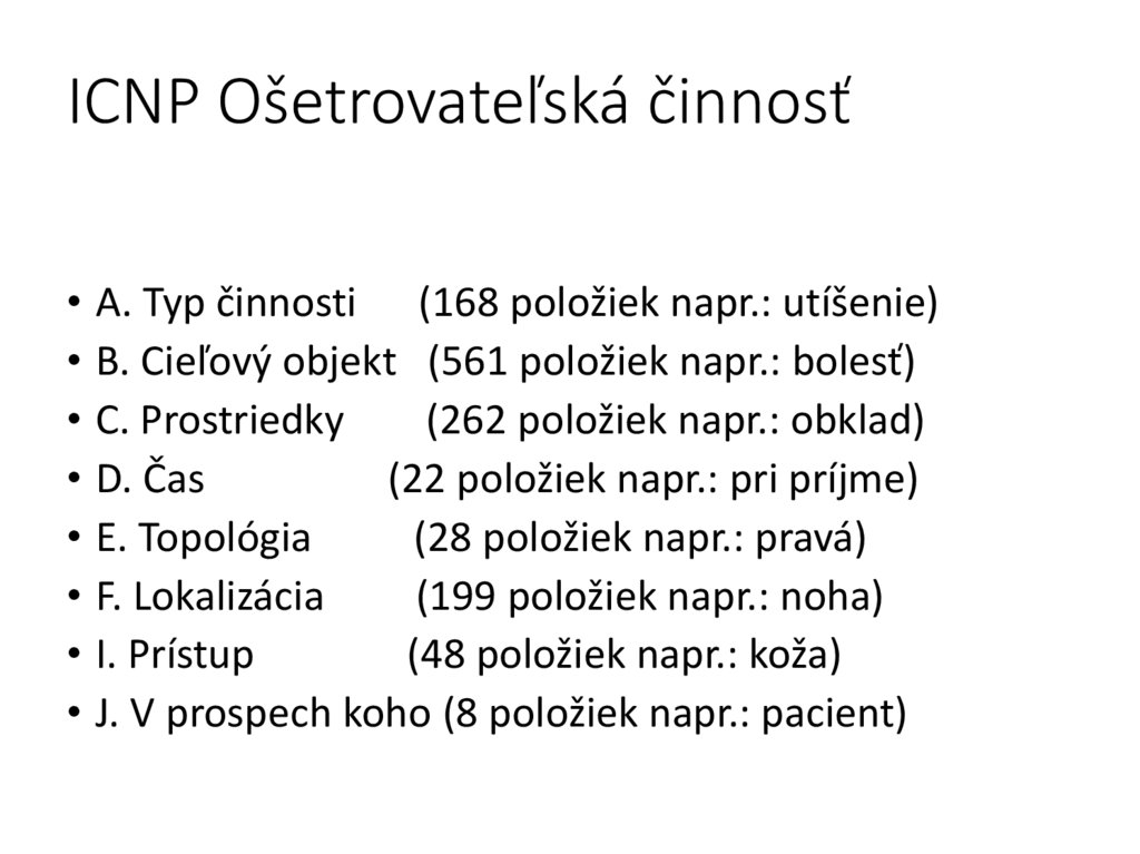 ICNP Ošetrovateľská činnosť• A. Typ činnosti (168 položiek napr.: utíšenie)