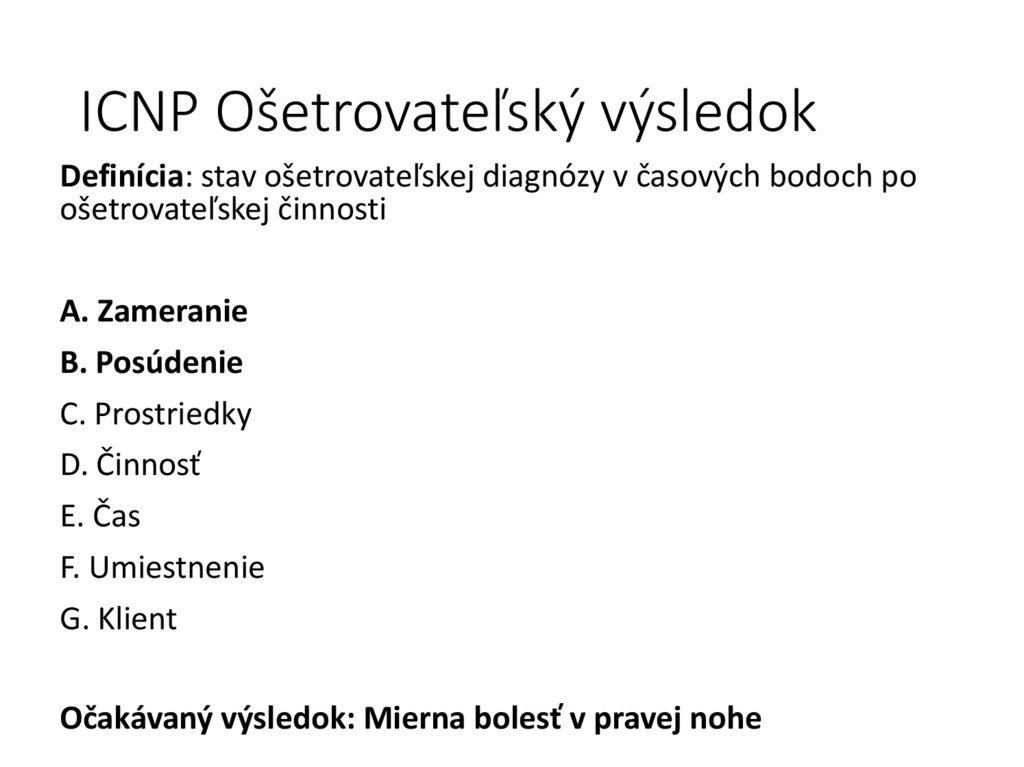 ICNP Ošetrovateľský výsledokDefinícia: stav ošetrovateľskej diagnózy v časových bodoch po
