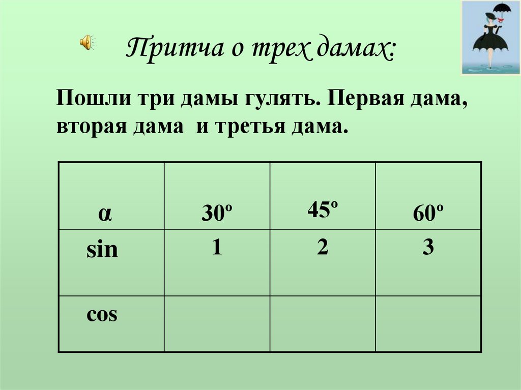 Жил рассеянный математик, и каждый разпреобразовывая тригонометрические функции углов