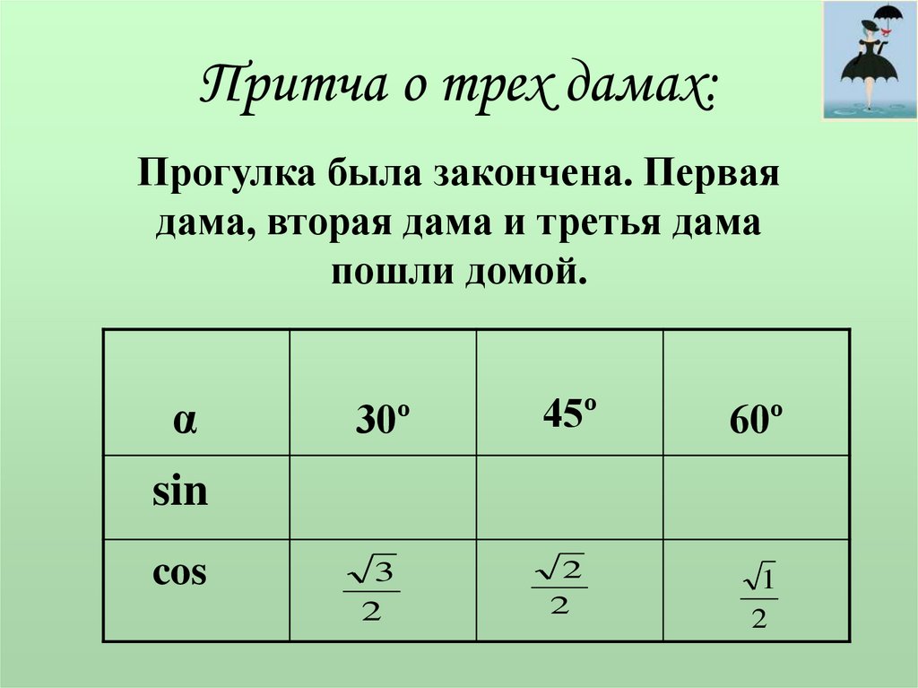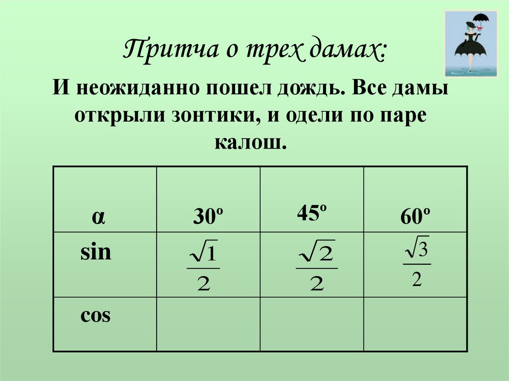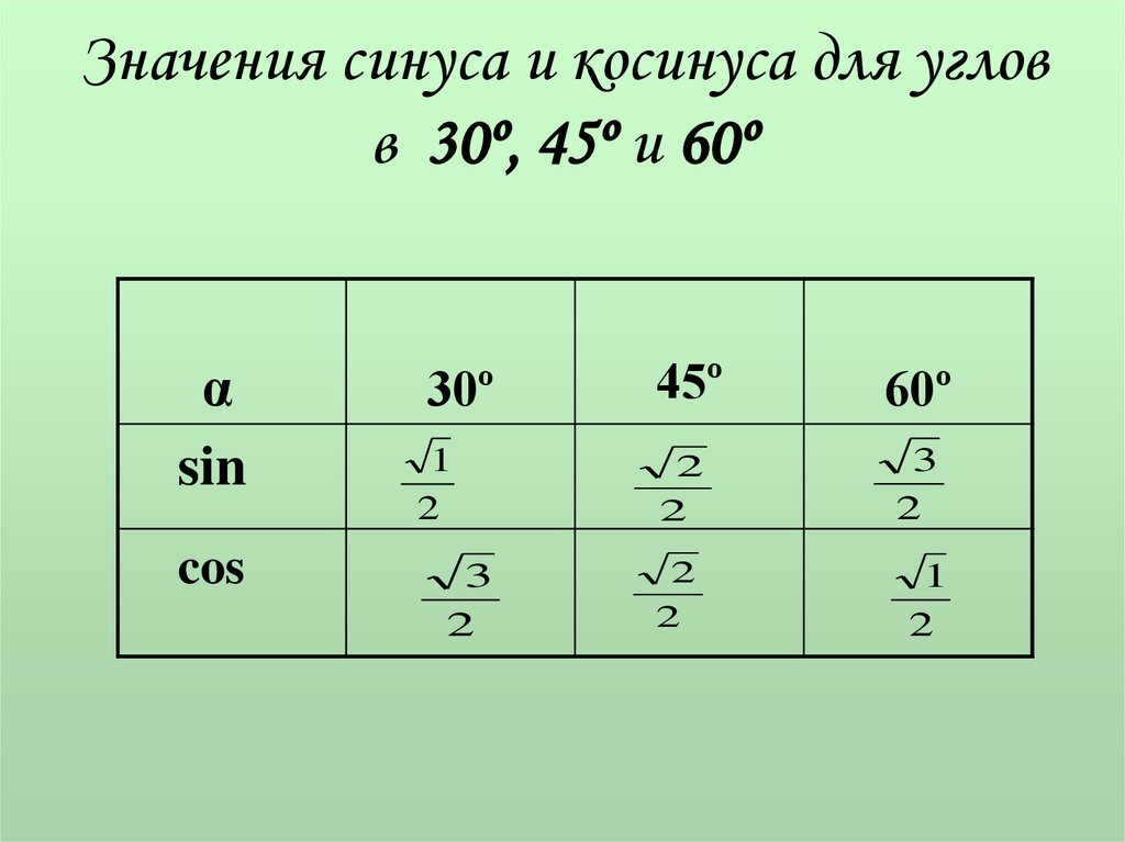 5. Значения синуса и косинуса для углов в 30º, 45º и 60º