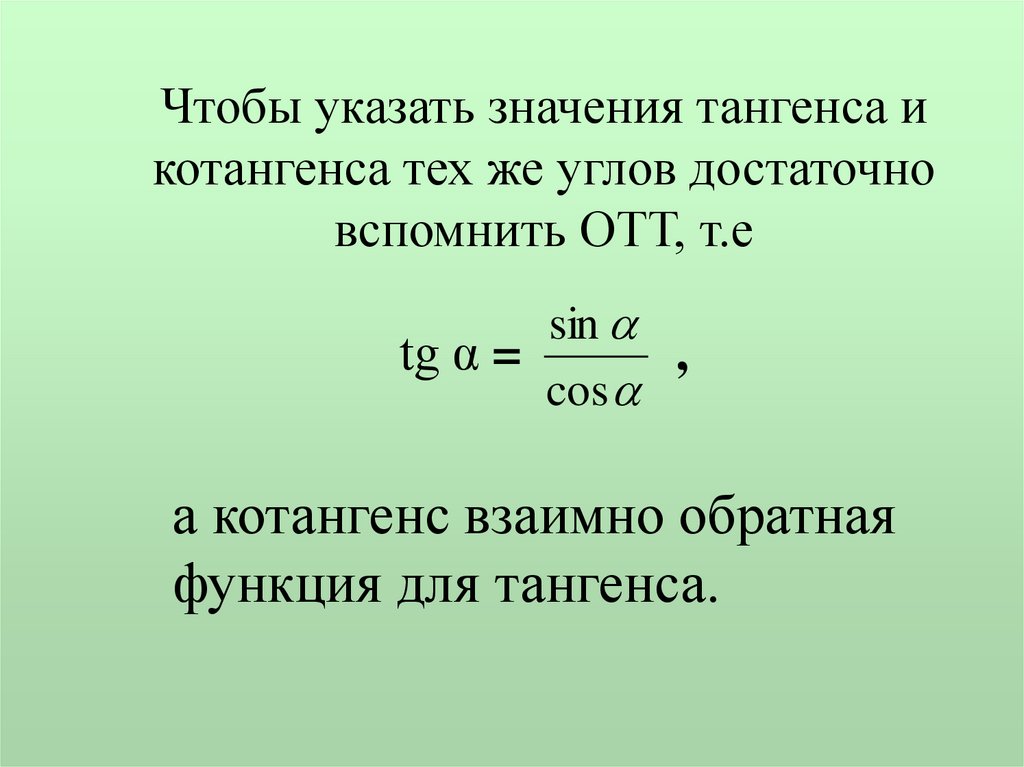 Чтобы указать значения тангенса икотангенса тех же углов достаточно