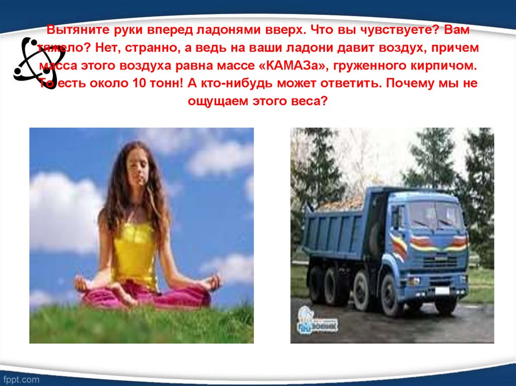 Вытяните руки вперед ладонями вверх. Что вы чувствуете? Вамтяжело? Нет, странно, а ведь на ваши ладони давит воздух, причем