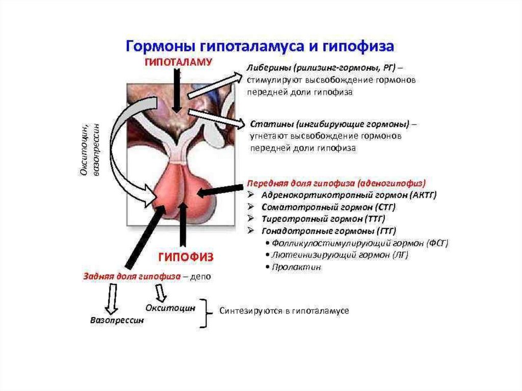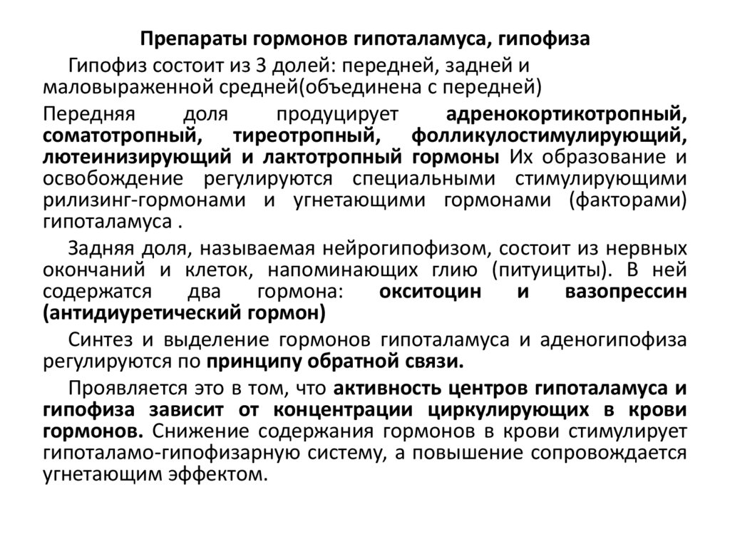 Препараты гормонов гипоталамуса, гипофизаГипофиз состоит из 3 долей: передней, задней и