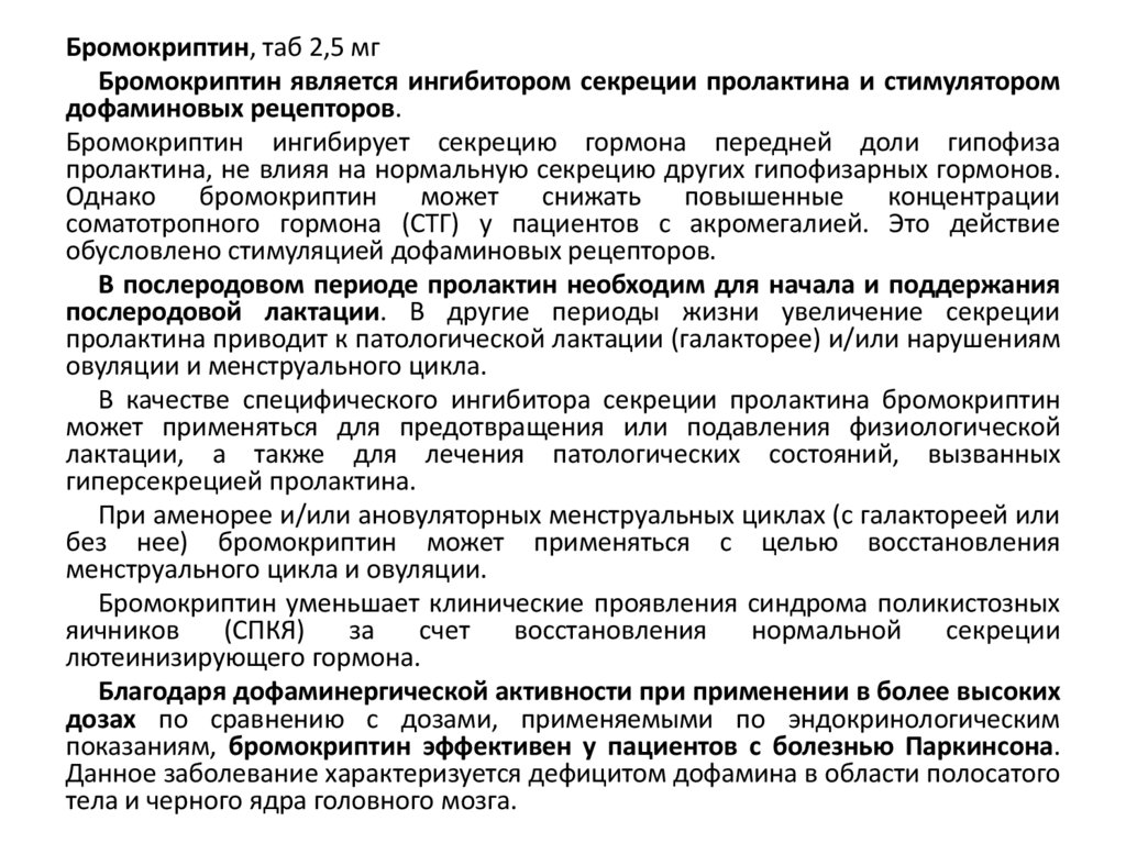 Бромокриптин, таб 2,5 мгБромокриптин является ингибитором секреции пролактина и стимулятором