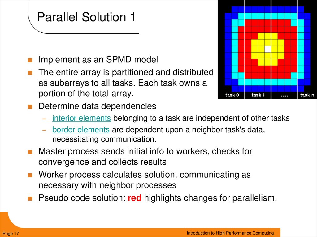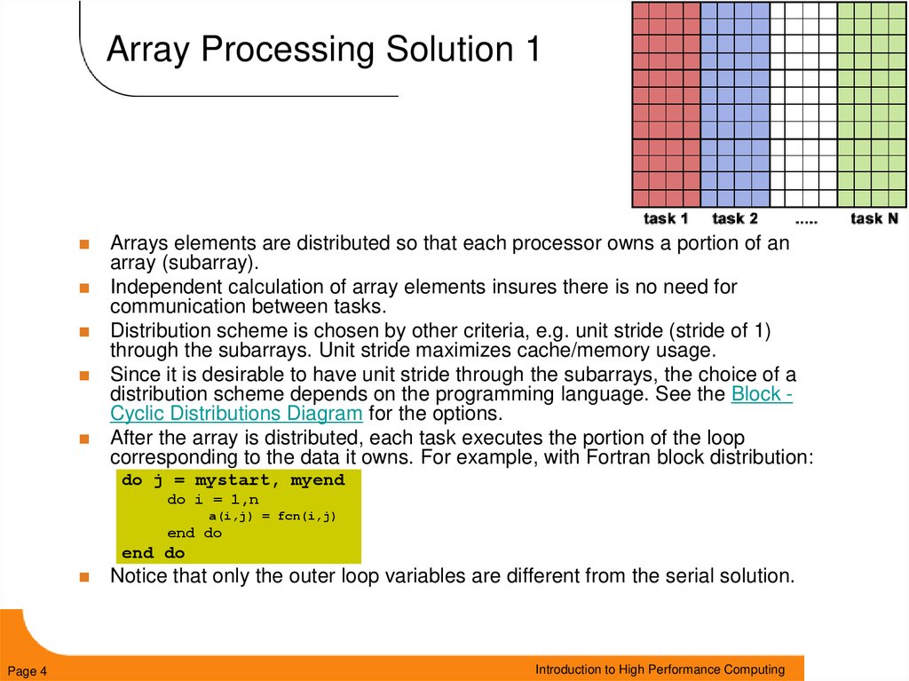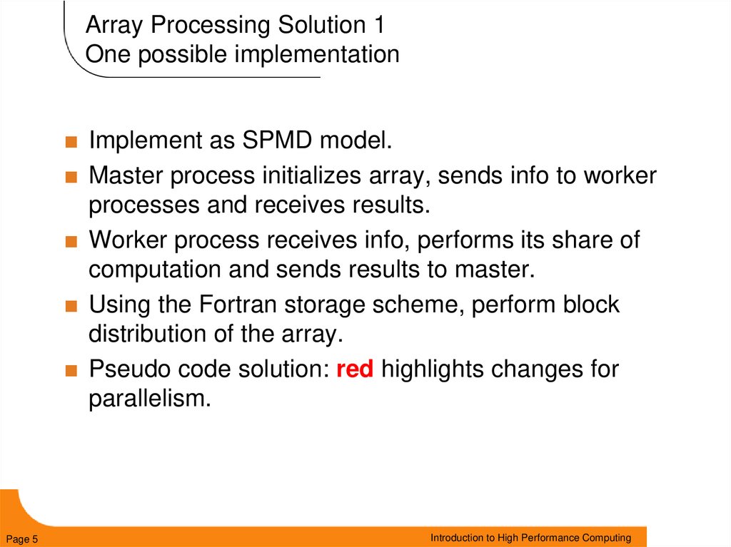 Implement as an SPMD modelThe entire array is partitioned and distributed