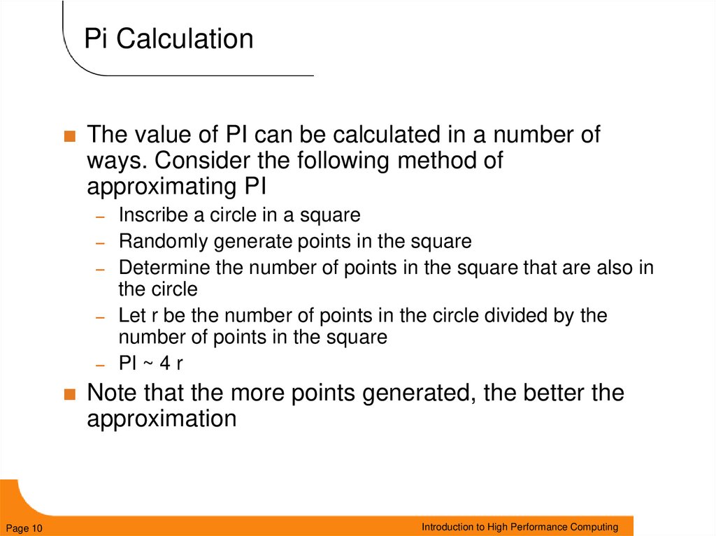 The value of PI can be calculated in a number ofways. Consider the following method of