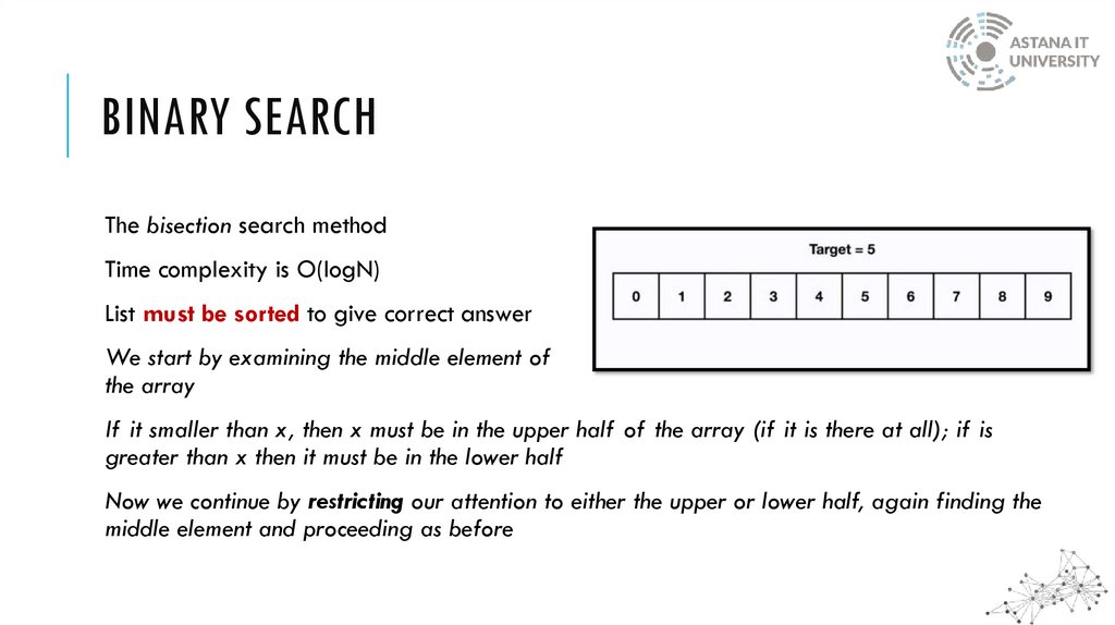If it smaller than x, then x must be in the upper half of the array (if it is there at all); if is