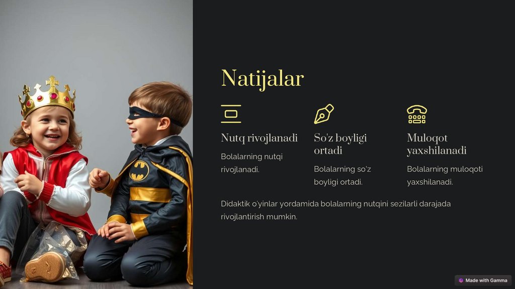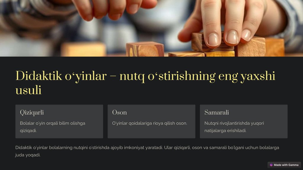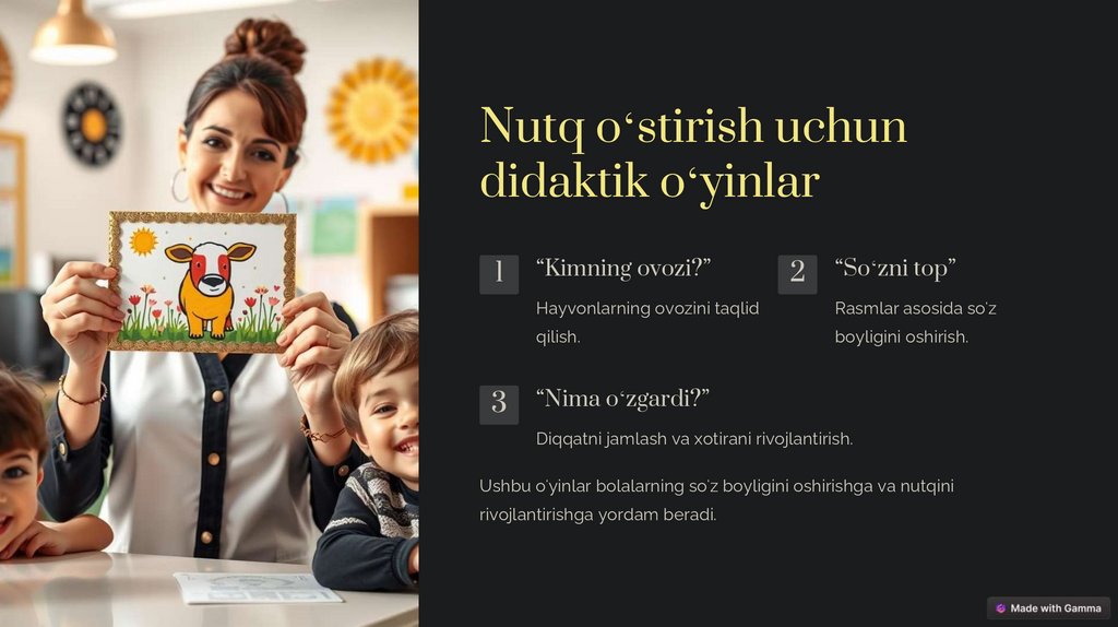 Didaktik oʻyinlar bolalarning nutqini oʻstirishda ajoyib imkoniyat yaratadi. Ular qiziqarli, oson va samarali boʻlgani uchun bolalarga