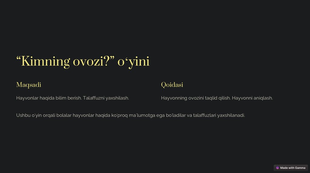Ushbu oʻyin orqali bolalar hayvonlar haqida koʻproq maʼlumotga ega boʻladilar va talaffuzlari yaxshilanadi.