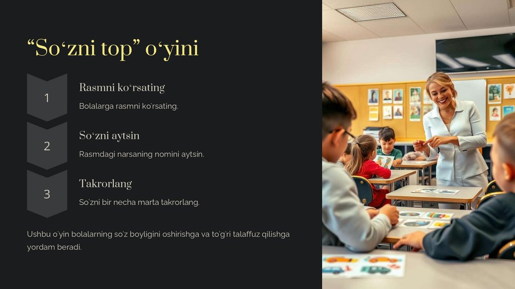 Ushbu oʻyin bolalarning soʻz boyligini oshirishga va toʻgʻri talaffuz qilishga