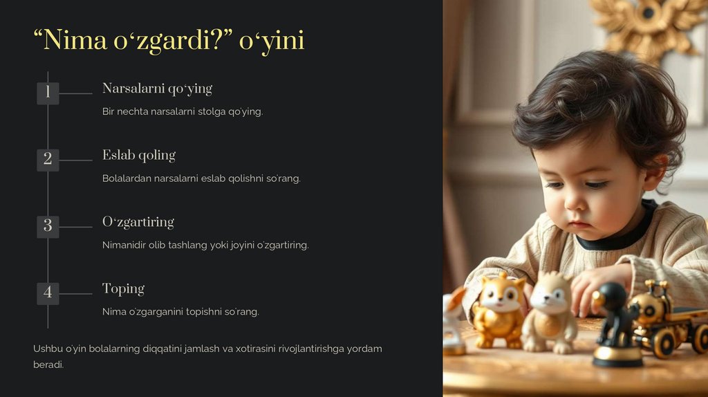Ushbu oʻyin bolalarning diqqatini jamlash va xotirasini rivojlantirishga yordam