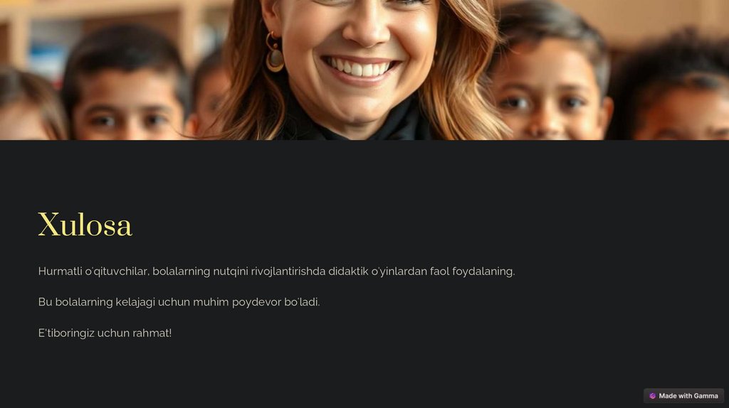 XulosaHurmatli oʻqituvchilar, bolalarning nutqini rivojlantirishda didaktik oʻyinlardan faol foydalaning.