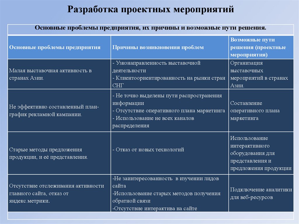 Разработка проектных мероприятийОсновные проблемы предприятия, их причины и возможные пути решения.