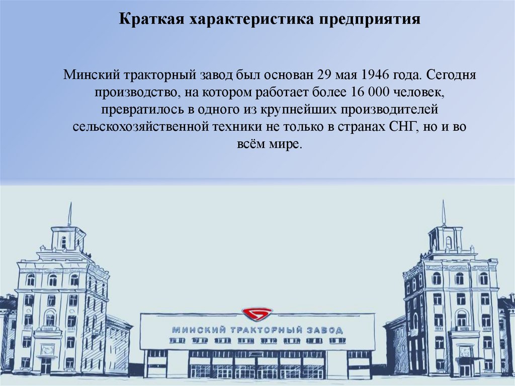 Краткая характеристика предприятияМинский тракторный завод был основан 29 мая 1946 года. Сегодня