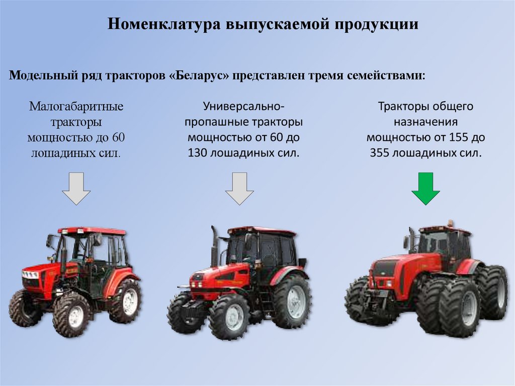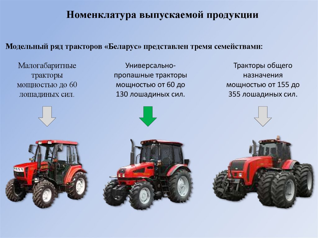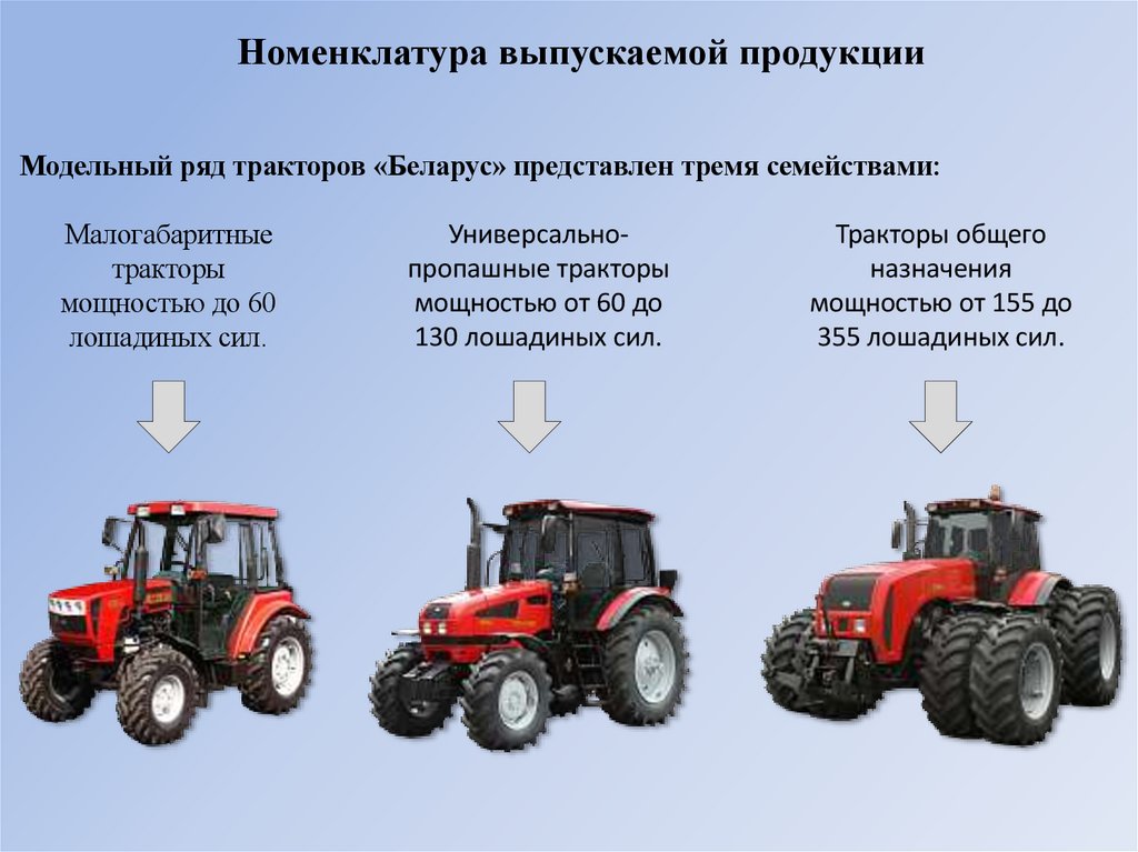 Номенклатура выпускаемой продукцииМодельный ряд тракторов «Беларус» представлен тремя семействами: