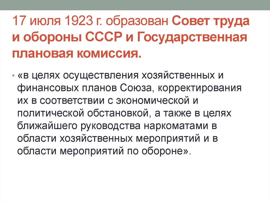 19. 17 июля 1923 г. образован Совет труда и обороны СССР и Государственная плановая комиссия.