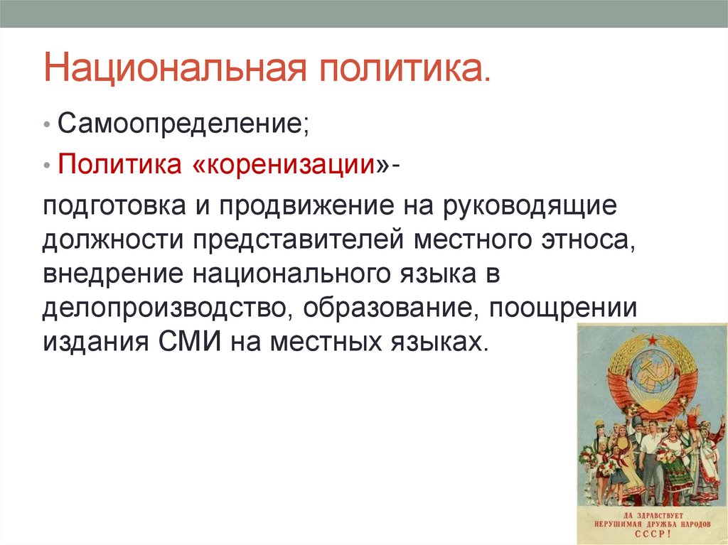• Самоопределение;• Политика «коренизации»-