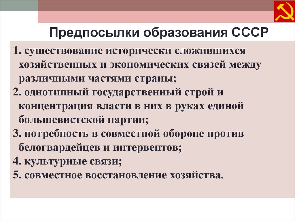 Предпосылки образования СССР1. существование исторически сложившихся
