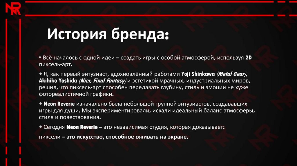 История бренда:• Всё началось с одной идеи – создать игры с особой атмосферой, используя 2D