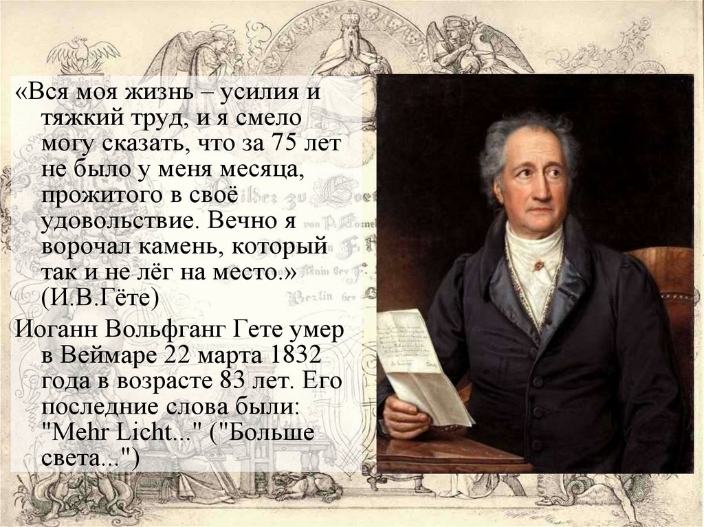• Иоганн Вольфганг Гёте прожил долгую жизнь,наполненную плодотворным трудом в литературе. Начав