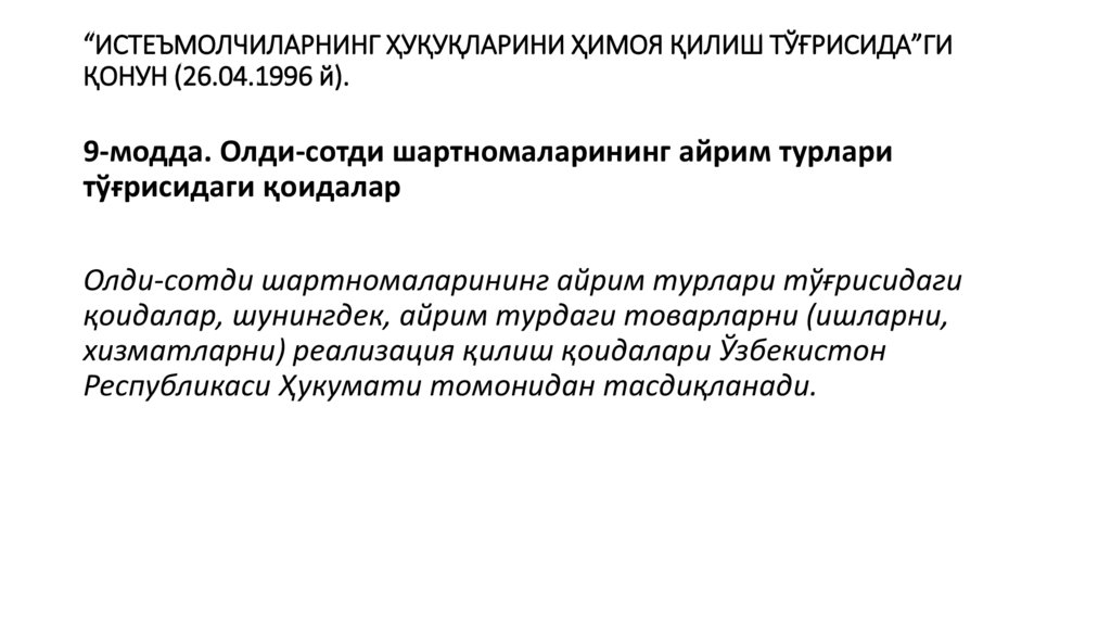 “ИСТЕЪМОЛЧИЛАРНИНГ ҲУҚУҚЛАРИНИ ҲИМОЯ ҚИЛИШ ТЎҒРИСИДА”ГИҚОНУН (26.04.1996 й).