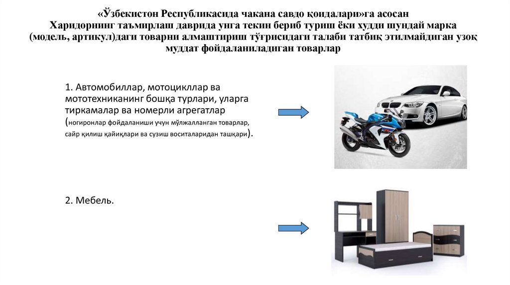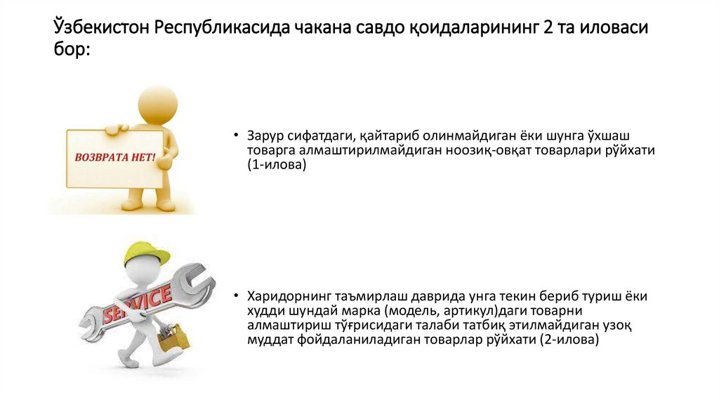 «Ўзбекистон Республикасида чакана савдо қоидалари»га асосанЗарур сифатдаги, қайтариб олинмайдиган ёки шунга ўхшаш товарга
