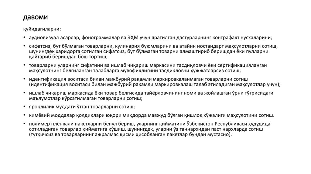 • яроқлилик муддати ўтган товарларни сотиш;