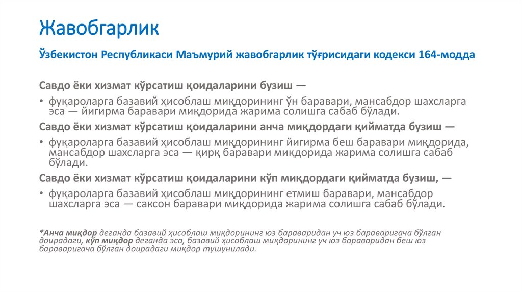 шахсларга эса — беш бараваридан ўн бараваригача миқдорда жарима солишга сабаб бўлади.