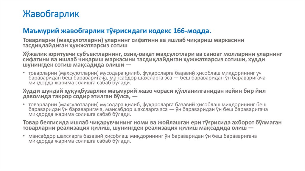ЖавобгарликМаъмурий жавобгарлик тўғрисидаги кодекс 166-модда.