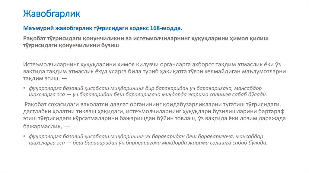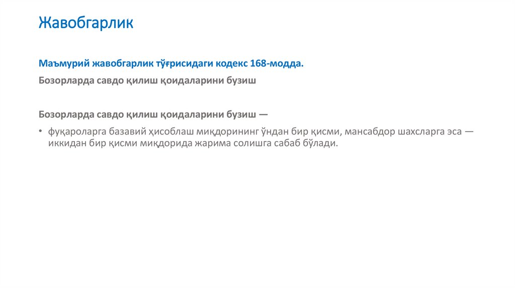 ЖавобгарликМаъмурий жавобгарлик тўғрисидаги кодекс 168-модда.