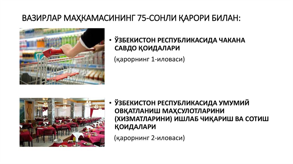 ЎЗБЕКИСТОН РЕСПУБЛИКАСИ ВАЗИРЛАР МАҲКАМАСИ ҚАРОРИ“Ўзбекистон Республикасида чакана савдо қоидаларини ҳамда