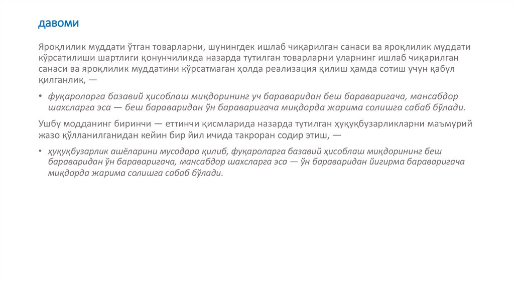 шахсларга эса — уч бараваридан беш бараваригача миқдорда жарима солишга сабаб бўлади.