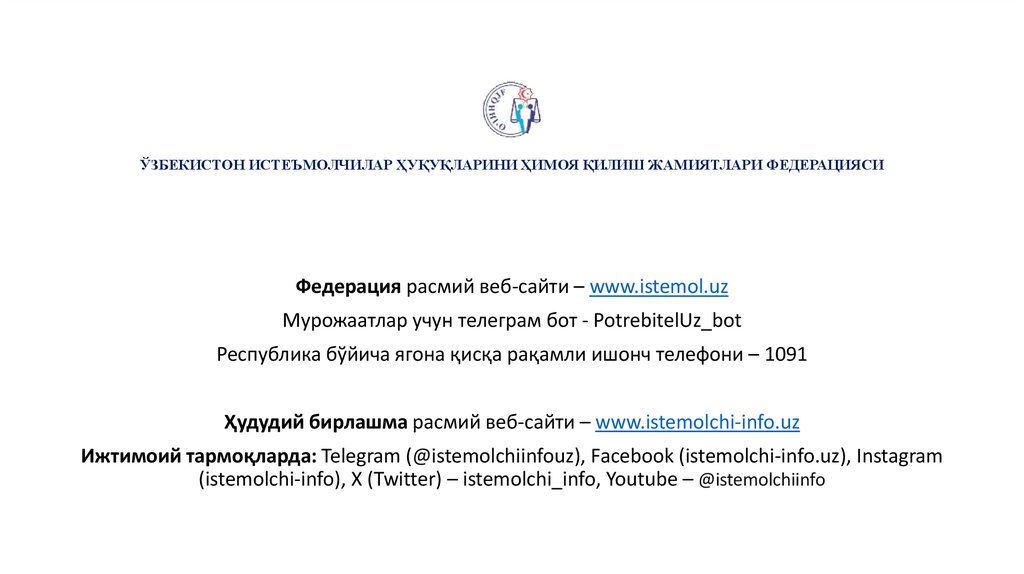 Ижтимоий тармоқларда: Telegram (@istemolchiinfouz), Facebook (istemolchi-info.uz), Instagram