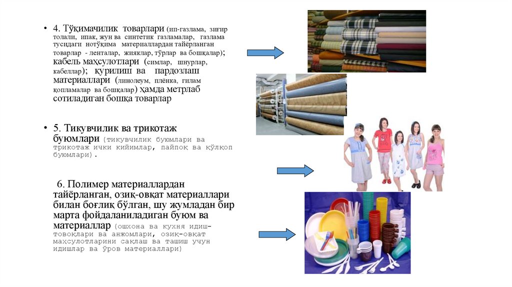 • 4. Тўқимачилик товарлари (ип-газлама, зиғиртолали, ипак, жун ва синтетик газламалар, газлама