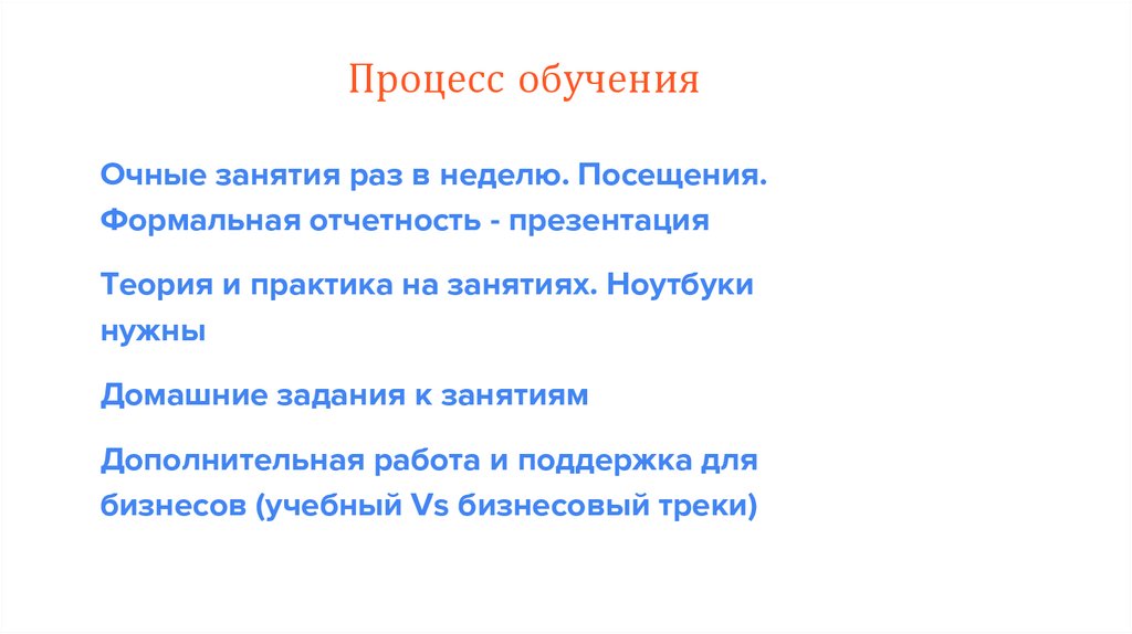 Процесс обученияОчные занятия раз в неделю. Посещения.