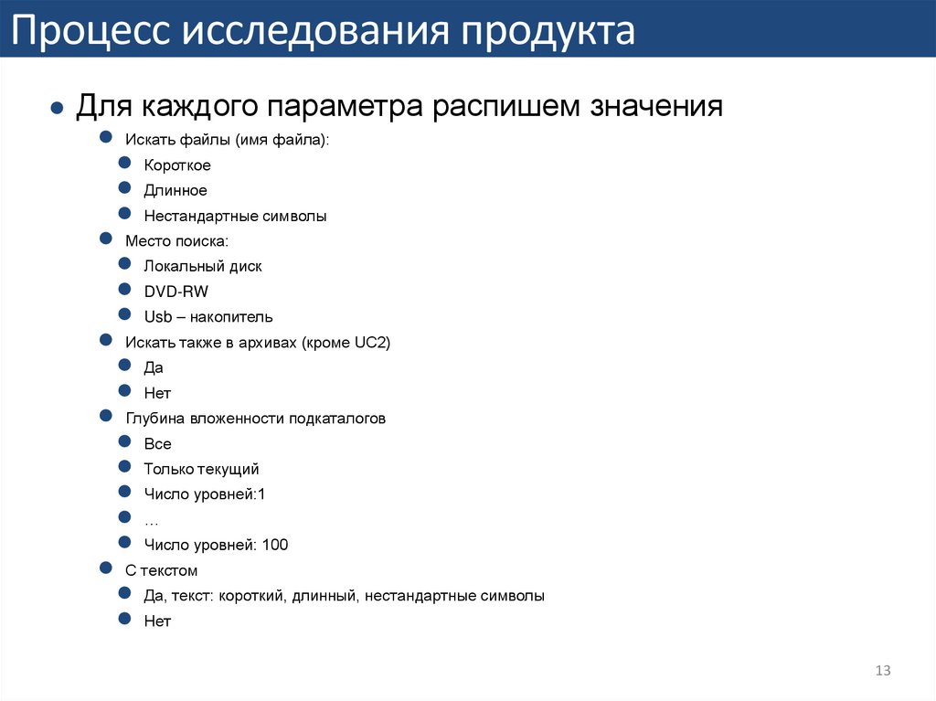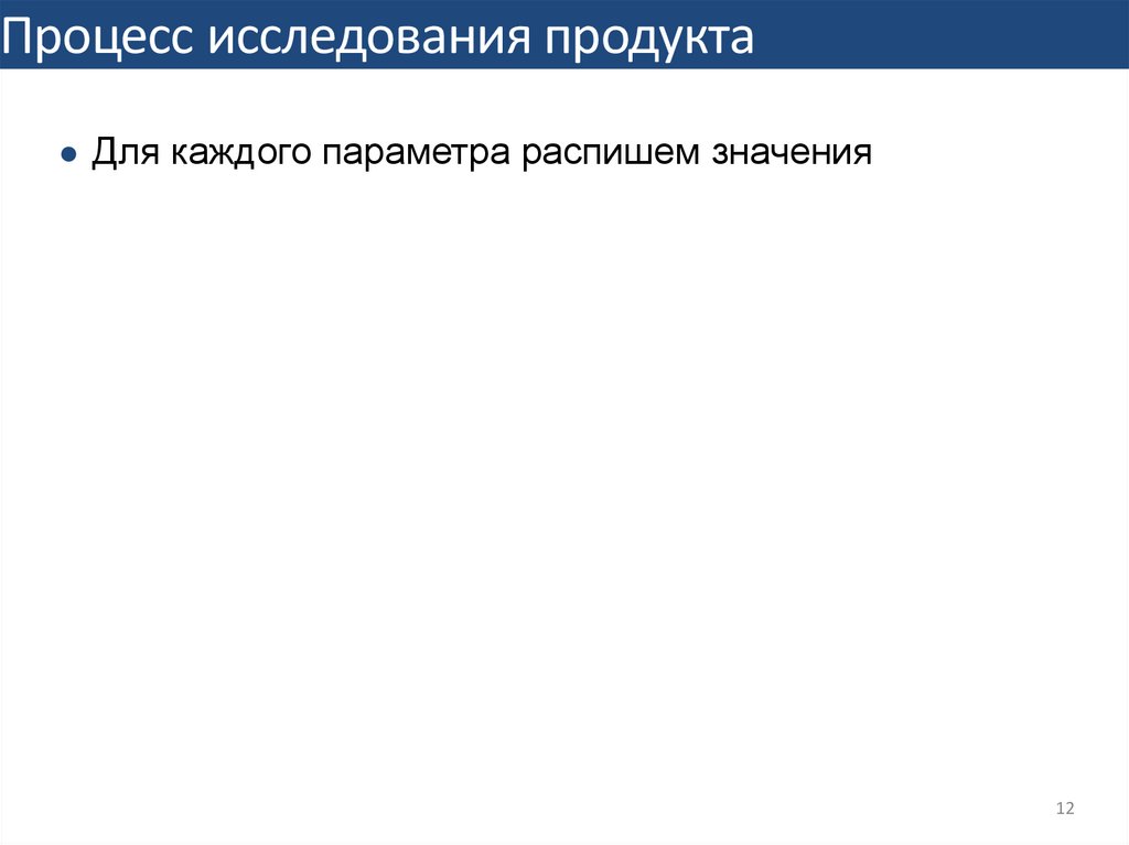 Процесс исследования продукта● Для каждого параметра распишем значения