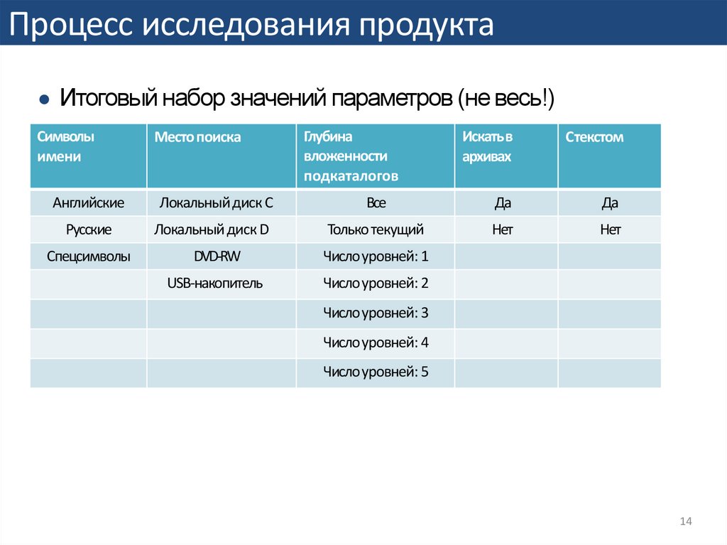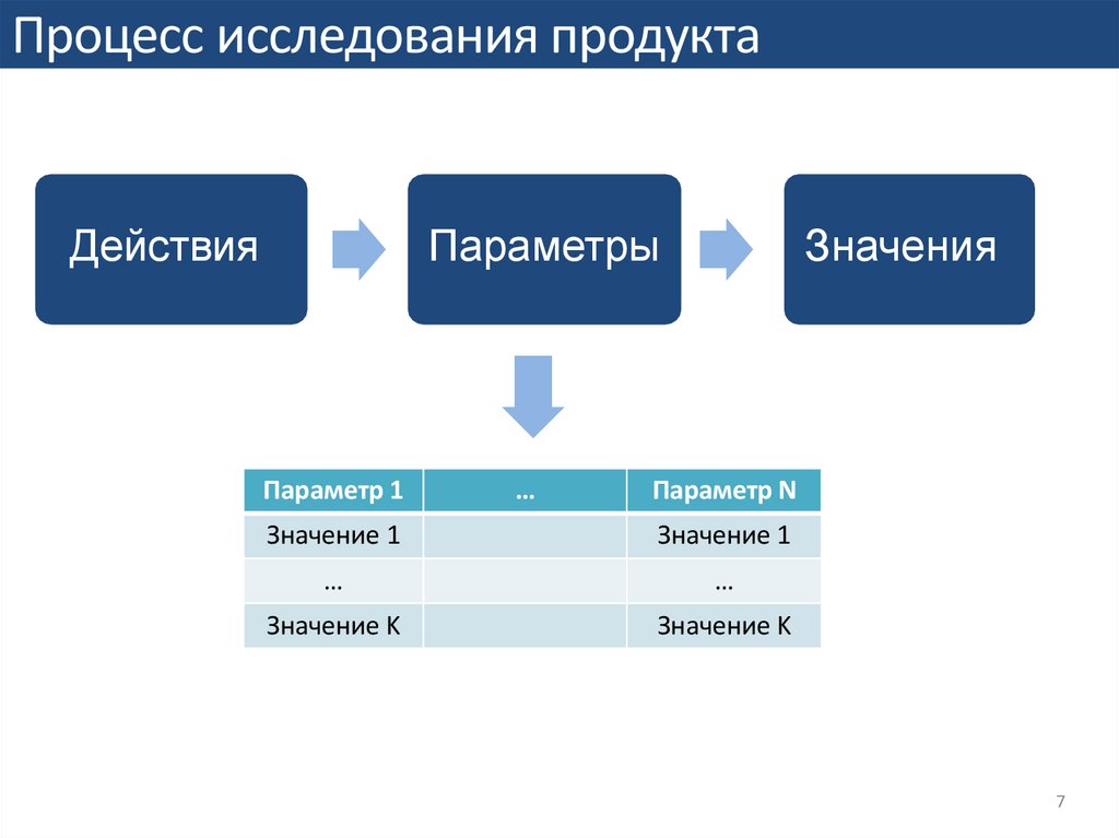 Процесс исследования продукта● Итоговый набор значений параметров (не весь!)