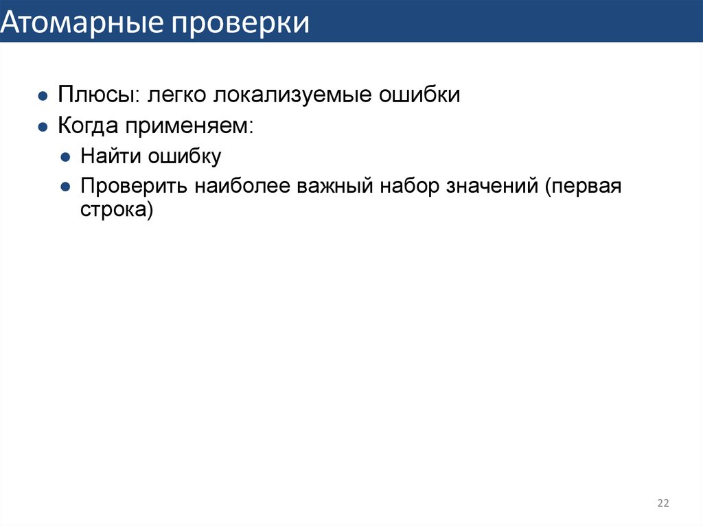 Атомарные проверки● Плюсы: легко локализуемые ошибки