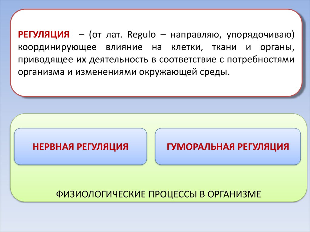 РЕГУЛЯЦИЯ – (от лат. Regulo – направляю, упорядочиваю)координирующее влияние на клетки, ткани и органы,