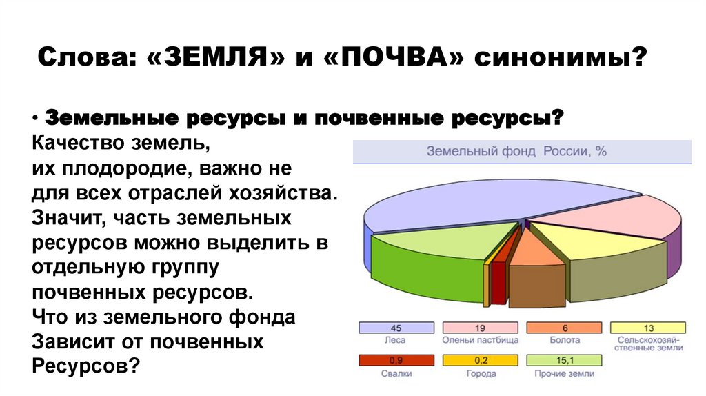 Слова: «ЗЕМЛЯ» и «ПОЧВА» синонимы?• Земельные ресурсы и почвенные ресурсы?