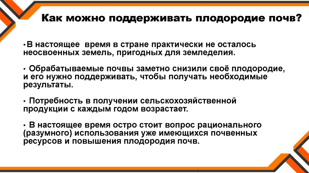 Как можно поддерживать плодородие почв?• В настоящее время в стране практически не осталось