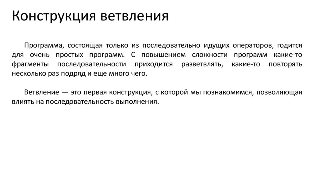 Ветвление — это первая конструкция, с которой мы познакомимся, позволяющая